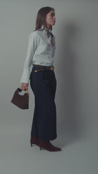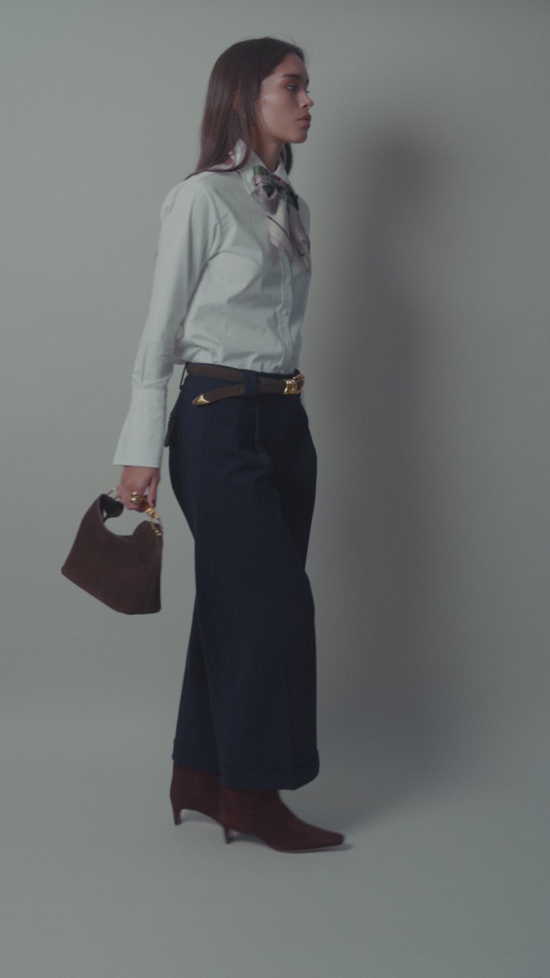 The Beverly wide-leg pant is a mid to high rise, wide-leg cropped ankle pant that is designed to fit loose and wide through the leg.