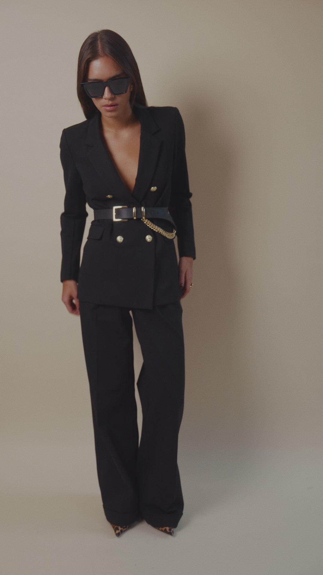 The Beverly wide-leg pant is a mid to high rise, wide-leg long pant that is designed to fit loose and wide through the leg.